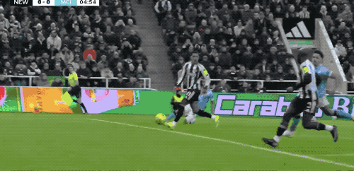 下半场开始仅仅4分钟,阿克45度传中,皮球打在戈登的两腿之间,差点造成纽卡10号的自摆乌龙。