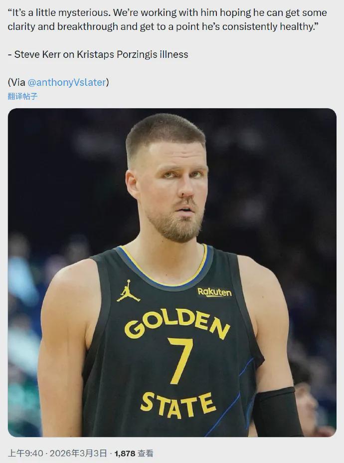 言归正传,其实本场比赛主角为没有上场的“铂金”波尔津吉斯......这哥们是真离谱,为勇士打了一场比赛之后,就消失了。